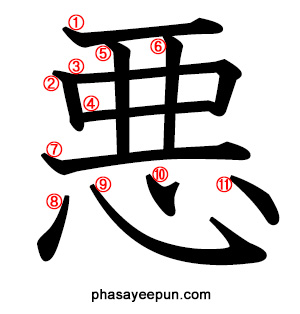 悪 : kanji, คันจิ, ภาษาญี่ปุ่น 2022.03.232022.05.07 จำนวนขีดทั้งหมด: 11 ชั้นเรียน: ป.3 วิธีอ่าน: ตัวคาตาคานะ คือเสียงองโยะมิ, ตัวฮิรางานะ คือเสียงคุงโยะมิ アク、オ、わる-い ฝึกพิมพ์ดีด คำตัวอย่าง: 悪い warui https://www.phasayeepun.com/wp-content/uploads/1-2-0369-1.wav ไม่ดี คำตัวอย่าง: 善悪 sen aku https://www.phasayeepun.com/wp-content/uploads/1-2-0369-2.wav ความดีและความชั่ว คำตัวอย่าง: 悪寒がする okan ga suru https://www.phasayeepun.com/wp-content/uploads/1-2-0369-3.wav รู้สึกหนาว