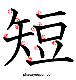 短 : kanji, คันจิ, ภาษาญี่ปุ่น 2022.03.232022.05.07 จำนวนขีดทั้งหมด: 12 ชั้นเรียน: ป.3 วิธีอ่าน: ตัวคาตาคานะ คือเสียงองโยะมิ, ตัวฮิรางานะ คือเสียงคุงโยะมิ タン、みじか-い ฝึกพิมพ์ดีด คำตัวอย่าง: 短い mijikai https://www.phasayeepun.com/wp-content/uploads/1-2-0403-1.wav สั้น คำตัวอย่าง: 短期 tanki https://www.phasayeepun.com/wp-content/uploads/1-2-0403-2.wav ระยะสั้น