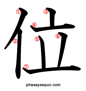 位 : kanji, คันจิ, ภาษาญี่ปุ่น 2022.03.232022.05.07 จำนวนขีดทั้งหมด: 7 ชั้นเรียน: ป.4 วิธีอ่าน: ตัวคาตาคานะ คือเสียงองโยะมิ, ตัวฮิรางานะ คือเสียงคุงโยะมิ イ、くらい ฝึกพิมพ์ดีด คำตัวอย่าง: 位が高い kurai ga takai https://www.phasayeepun.com/wp-content/uploads/1-2-0472-1.wav อันดับสูง คำตัวอย่าง: 1位 ichi i https://www.phasayeepun.com/wp-content/uploads/1-2-0472-2.wav อันดับ 1