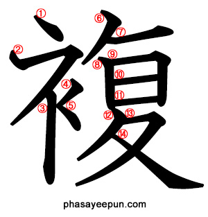 複 : kanji, คันจิ, ภาษาญี่ปุ่น 2022.03.232022.05.07 จำนวนขีดทั้งหมด: 14 ชั้นเรียน: ป.5 วิธีอ่าน: ตัวคาตาคานะ คือเสียงองโยะมิ, ตัวฮิรางานะ คือเสียงคุงโยะมิ フク ฝึกพิมพ์ดีด คำตัวอย่าง: 複雑 fukuzatsu https://www.phasayeepun.com/wp-content/uploads/1-2-0811-1.wav ความซับซ้อน