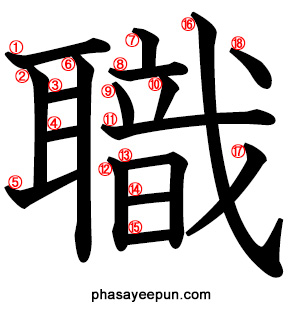 職 : kanji, คันจิ, ภาษาญี่ปุ่น 2022.03.232022.05.07 จำนวนขีดทั้งหมด: 18 ชั้นเรียน: ป.5 วิธีอ่าน: ตัวคาตาคานะ คือเสียงองโยะมิ, ตัวฮิรางานะ คือเสียงคุงโยะมิ ショク ฝึกพิมพ์ดีด คำตัวอย่าง: 職業 shokugyou https://www.phasayeepun.com/wp-content/uploads/1-2-0833-1.wav อาชีพ