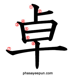 卓 : kanji, คันจิ, ภาษาญี่ปุ่น 2022.03.242022.05.07 จำนวนขีดทั้งหมด: 8 ชั้นเรียน: ม.1,2,3 วิธีอ่าน: ตัวคาตาคานะ คือเสียงองโยะมิ, ตัวฮิรางานะ คือเสียงคุงโยะมิ タク ฝึกพิมพ์ดีด คำตัวอย่าง: 円卓 entaku https://www.phasayeepun.com/wp-content/uploads/1-2-1238-1.wav โต๊ะกลม