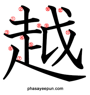 越 : kanji, คันจิ, ภาษาญี่ปุ่น 2022.03.242022.05.07 จำนวนขีดทั้งหมด: 12 ชั้นเรียน: ม.1,2,3 วิธีอ่าน: ตัวคาตาคานะ คือเสียงองโยะมิ, ตัวฮิรางานะ คือเสียงคุงโยะมิ エツ、こ-す、こ-える ฝึกพิมพ์ดีด คำตัวอย่าง: 超える koeru https://www.phasayeepun.com/wp-content/uploads/1-2-1610-1.wav เกิน คำตัวอย่าง: 越す kosu https://www.phasayeepun.com/wp-content/uploads/1-2-1610-2.wav ไปเลย คำตัวอย่าง: 超越 chou etsu https://www.phasayeepun.com/wp-content/uploads/1-2-1610-3.wav การอยู่นอกเหนือ, การเหนือความเข้าใจ