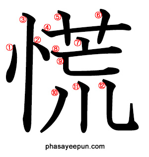慌 : kanji, คันจิ, ภาษาญี่ปุ่น 2022.03.242022.05.07 จำนวนขีดทั้งหมด: 12 ชั้นเรียน: ม.1,2,3 วิธีอ่าน: ตัวคาตาคานะ คือเสียงองโยะมิ, ตัวฮิรางานะ คือเสียงคุงโยะมิ コウ、あわ-てる、あわ-ただしい ฝึกพิมพ์ดีด คำตัวอย่าง: 慌てる awateru https://www.phasayeepun.com/wp-content/uploads/1-2-1636-1.wav ตื่นตกใจ, ตื่นตระหนก, รีบเร่ง คำตัวอย่าง: 朝は慌ただしい asa wa awatadashii https://www.phasayeepun.com/wp-content/uploads/1-2-1636-2.wav ไม่ว่างในตอนเช้า คำตัวอย่าง: 恐慌 kyoukou https://www.phasayeepun.com/wp-content/uploads/1-2-1636-3.wav ภาวะเศรษฐกิจตกต่ำครั้งใหญ่